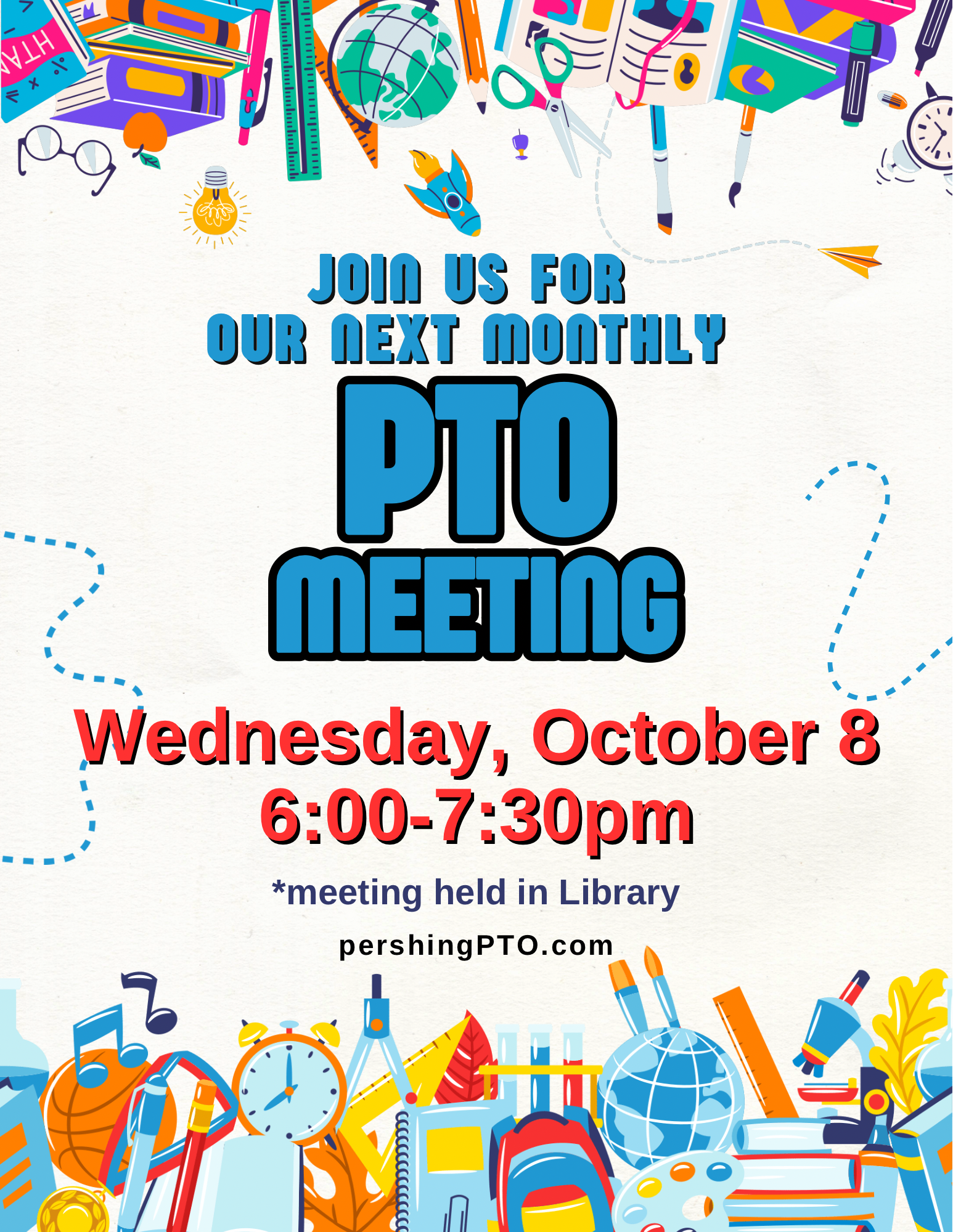 Join us for our October PTO meeting in the Pershing library. We're excited to see you there!